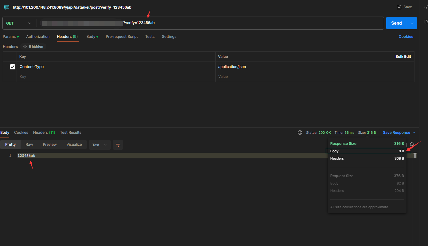 將填寫(xiě)的URL復(fù)制進(jìn)postman后面+?verify=123456ab 藍(lán)色的8個(gè)字節(jié)可隨意更換測(cè)試