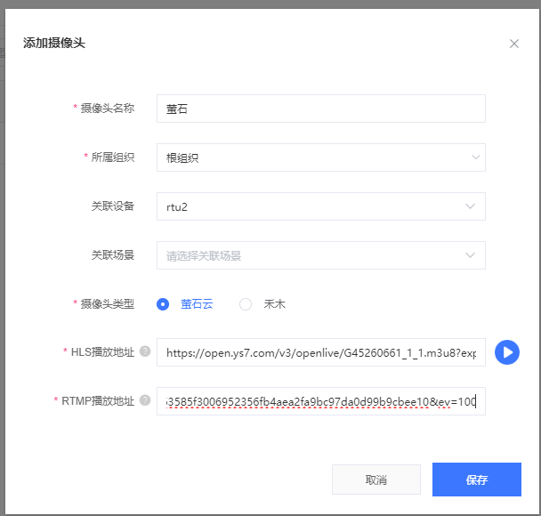 (2)目前支持可接入螢石云平臺的海康攝像頭,設(shè)置攝像頭的名稱,將之前查找到的HLS地址與RTMP地址復(fù)制到播放地址中,點擊后面的藍(lán)色播放按鈕可預(yù)覽畫面,選擇所屬組織,可選擇需要掛載在哪個設(shè)備下面,點保存。