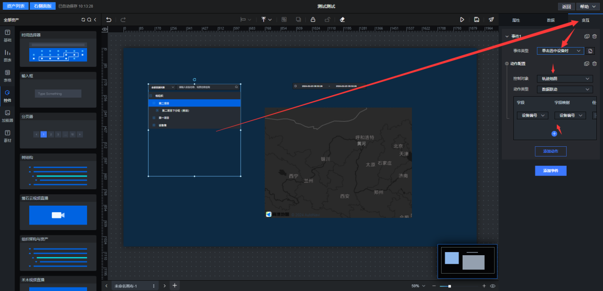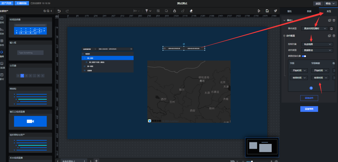 7、點擊時間選擇器配置交互,更改時間范圍時控制軌跡地圖的數(shù)據(jù)聯(lián)動,字段與映射配置開始時間與結(jié)束時間