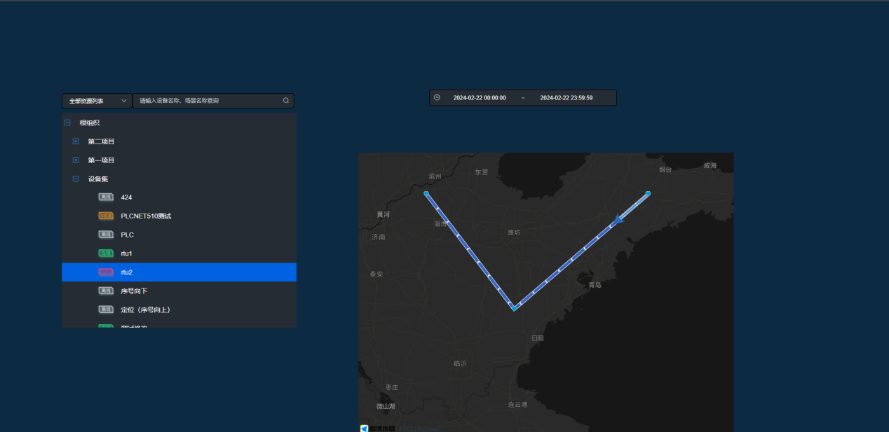 6、點擊組織結(jié)構(gòu)資產(chǎn)下拉框配置交互,單擊選中設(shè)備時控制軌跡地圖的數(shù)據(jù)聯(lián)動,字段與映射都是設(shè)備編號