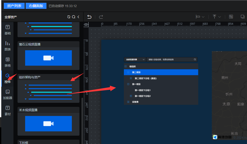 1、點擊左側(cè)控件欄,找到“組織架構(gòu)與資產(chǎn)”并拖進畫布