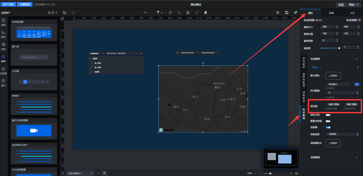 5、配置地圖屬性,點擊軌跡配置,綁定經(jīng)度、緯度數(shù)值
