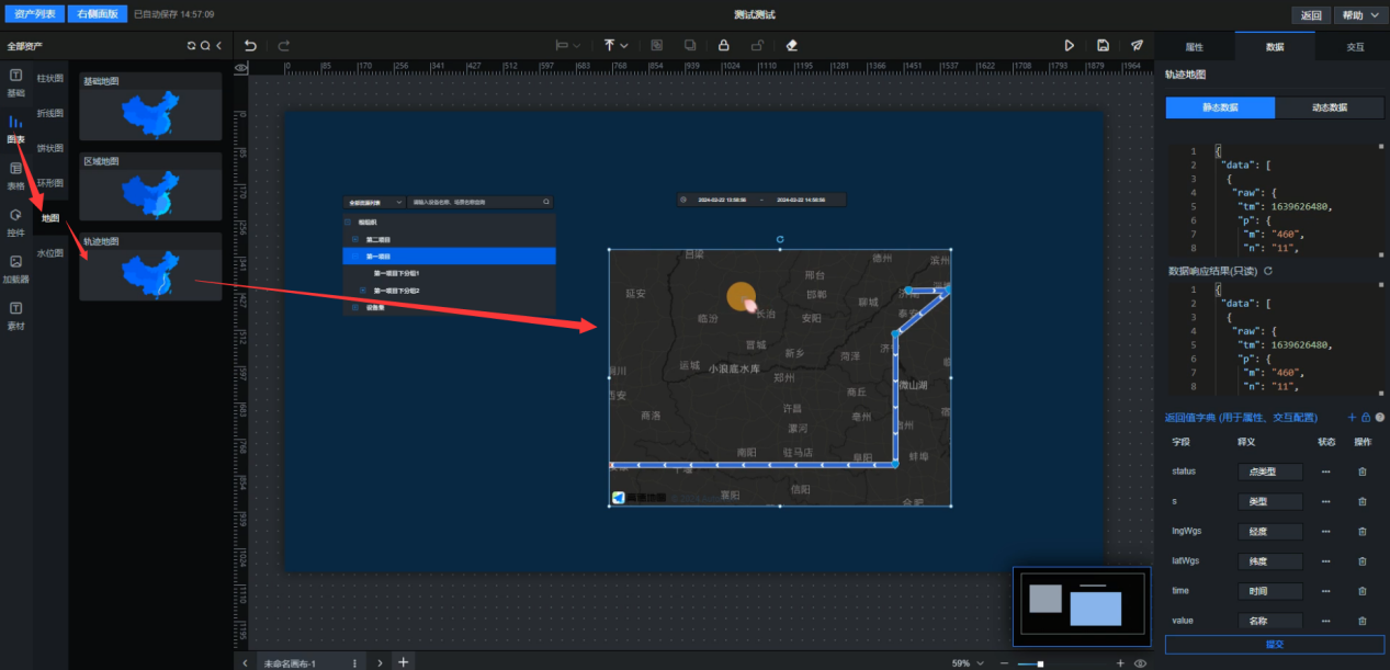 4、點擊地圖,在數(shù)據(jù)中綁定動態(tài)數(shù)據(jù),選擇“單個設(shè)備的歷史軌跡”數(shù)據(jù)模型