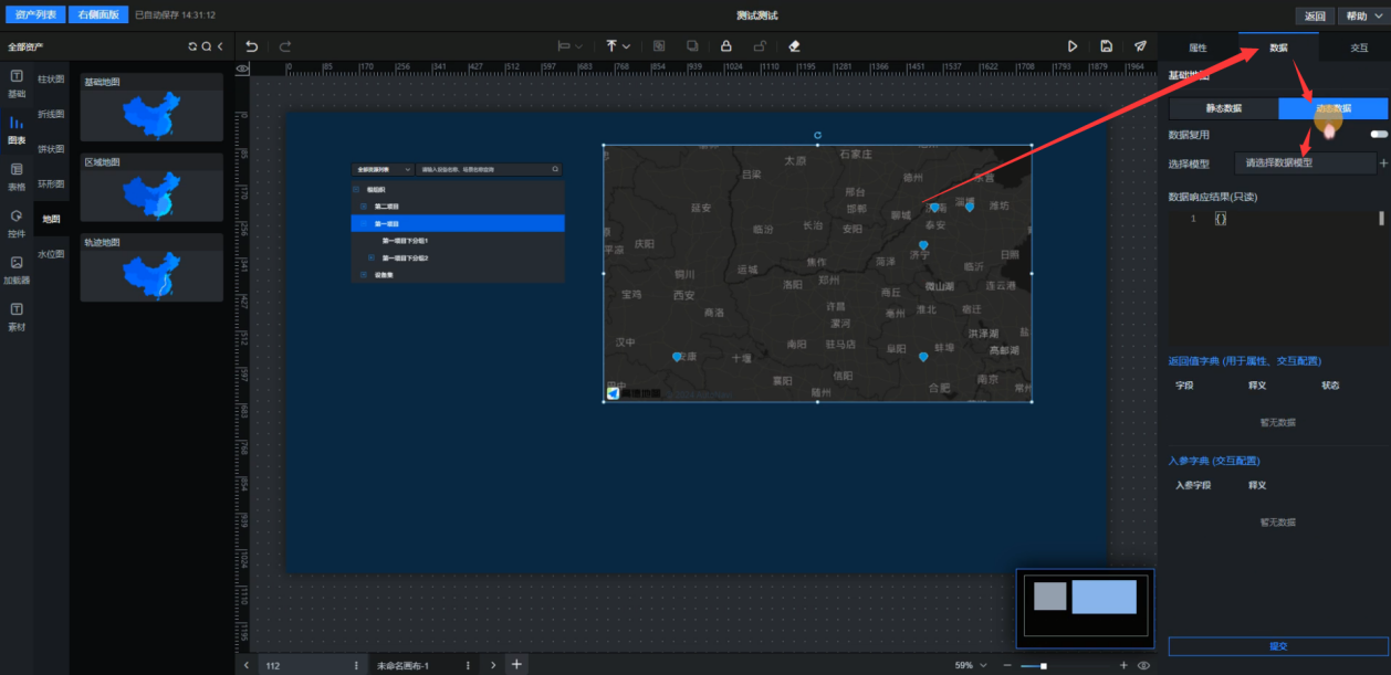 3、點(diǎn)擊地圖,右上角綁定數(shù)據(jù),點(diǎn)擊動態(tài)數(shù)據(jù),選擇對應(yīng)的數(shù)據(jù)模型