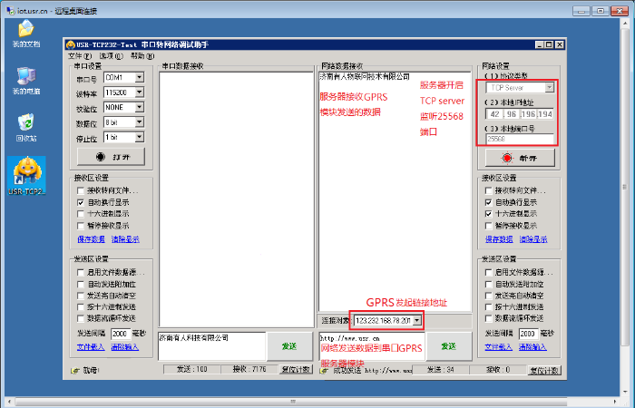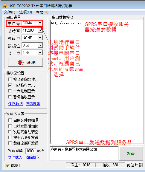 以上是服務器發(fā)送數(shù)據(jù)和接收數(shù)據(jù):以下使用電腦串口連接GPRS-DTU串口,電腦運行串口調(diào)試軟件,進行發(fā)送和接收服務器的數(shù)據(jù)。