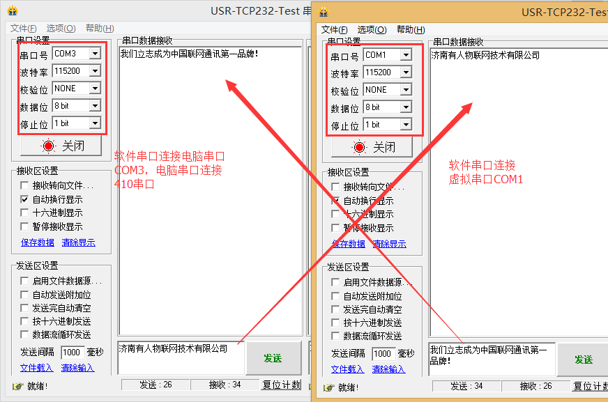打開(kāi)兩個(gè)USR_TCP232_Test軟件,一個(gè)連接COM3,一個(gè)連接虛擬串口COM1,實(shí)現(xiàn)兩個(gè)串口直接數(shù)據(jù)互發(fā)。