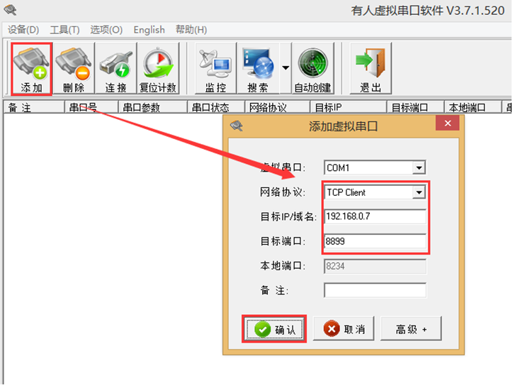 打開(kāi)虛擬串口軟件,點(diǎn)擊“添加”在彈出的窗口中設(shè)置虛擬串口信息,由于上述410S設(shè)備采用TCP server協(xié)議,所以此處網(wǎng)絡(luò)協(xié)議設(shè)置為TCP client。目標(biāo)IP和目標(biāo)端口設(shè)置為410S的IP和端口。然后點(diǎn)擊“確定”,建立虛擬串口COM1.