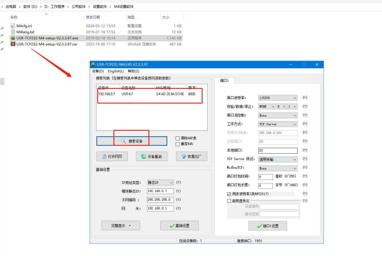 USR-K7和電腦網(wǎng)線直連,打開M4軟件,搜到USR-K7的IP。