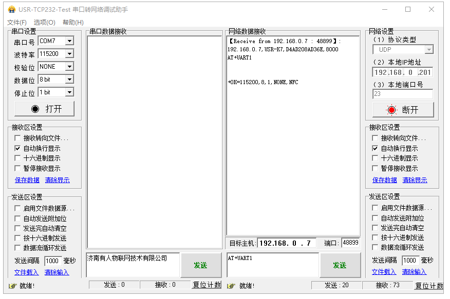 4、收到USR-K7 IP信息后,30s 內(nèi)網(wǎng)絡(luò)端發(fā)送AT+UART1,后面帶回車換行發(fā)送,網(wǎng)絡(luò)端返回AT指令內(nèi)容。
