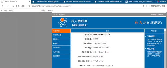 本文測(cè)試使用的網(wǎng)口設(shè)備為USR-TCP232-410S 實(shí)現(xiàn)的功能是訪問410S內(nèi)置網(wǎng)頁及連接410S的TCP Server透?jìng)鲾?shù)據(jù)。410S的IP為192.168.1.128,網(wǎng)頁端口80,TCP Server監(jiān)聽端口23。