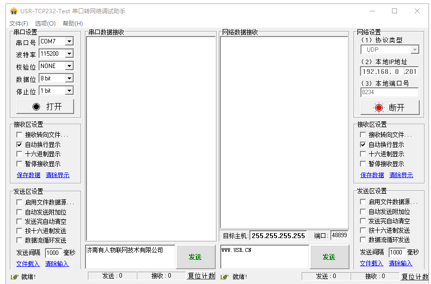 2、打開網(wǎng)絡助手,建立UDP連接,本地IP填電腦IP 192.168.0.201 本地端口號填8234