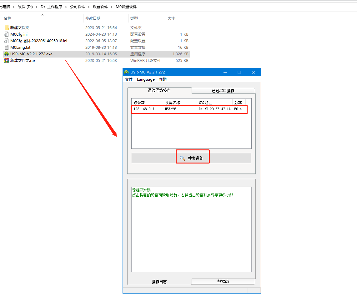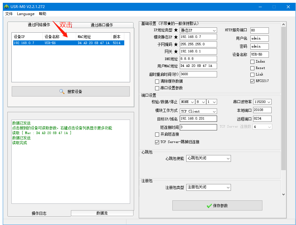 USR-K6和電腦網(wǎng)線直連,打開M4軟件,搜到USR-K6的IP。