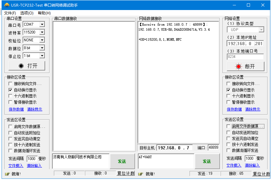 4、收到USR-K6 IP信息后,30s 內(nèi)網(wǎng)絡端發(fā)送AT+UART,后面帶回車換行發(fā)送,網(wǎng)絡端返回AT指令內(nèi)容。