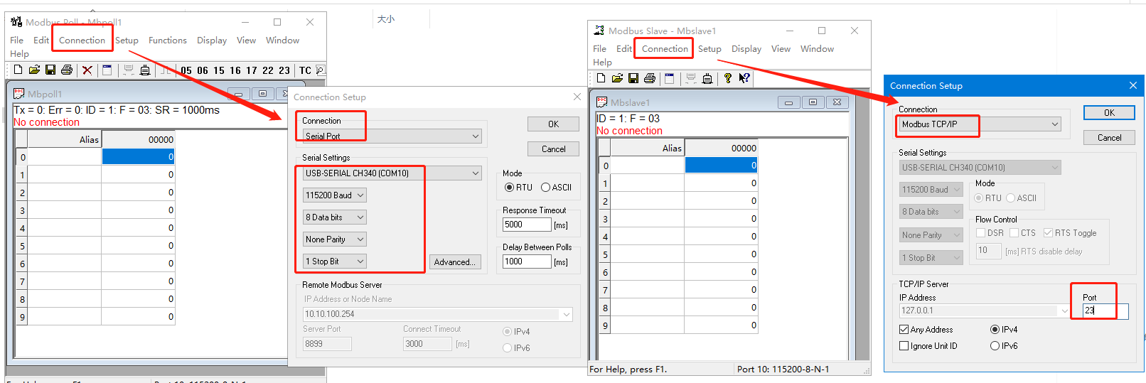 (2)Modbus Slave軟件,點(diǎn)擊Connection,選擇Modbus TCP/IP,Port端口23。最后點(diǎn)擊OK。