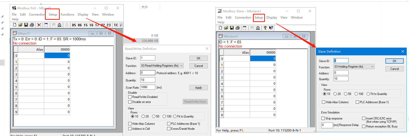 (2)打開(kāi)MODBUS SLAVE軟件,點(diǎn)擊Setup