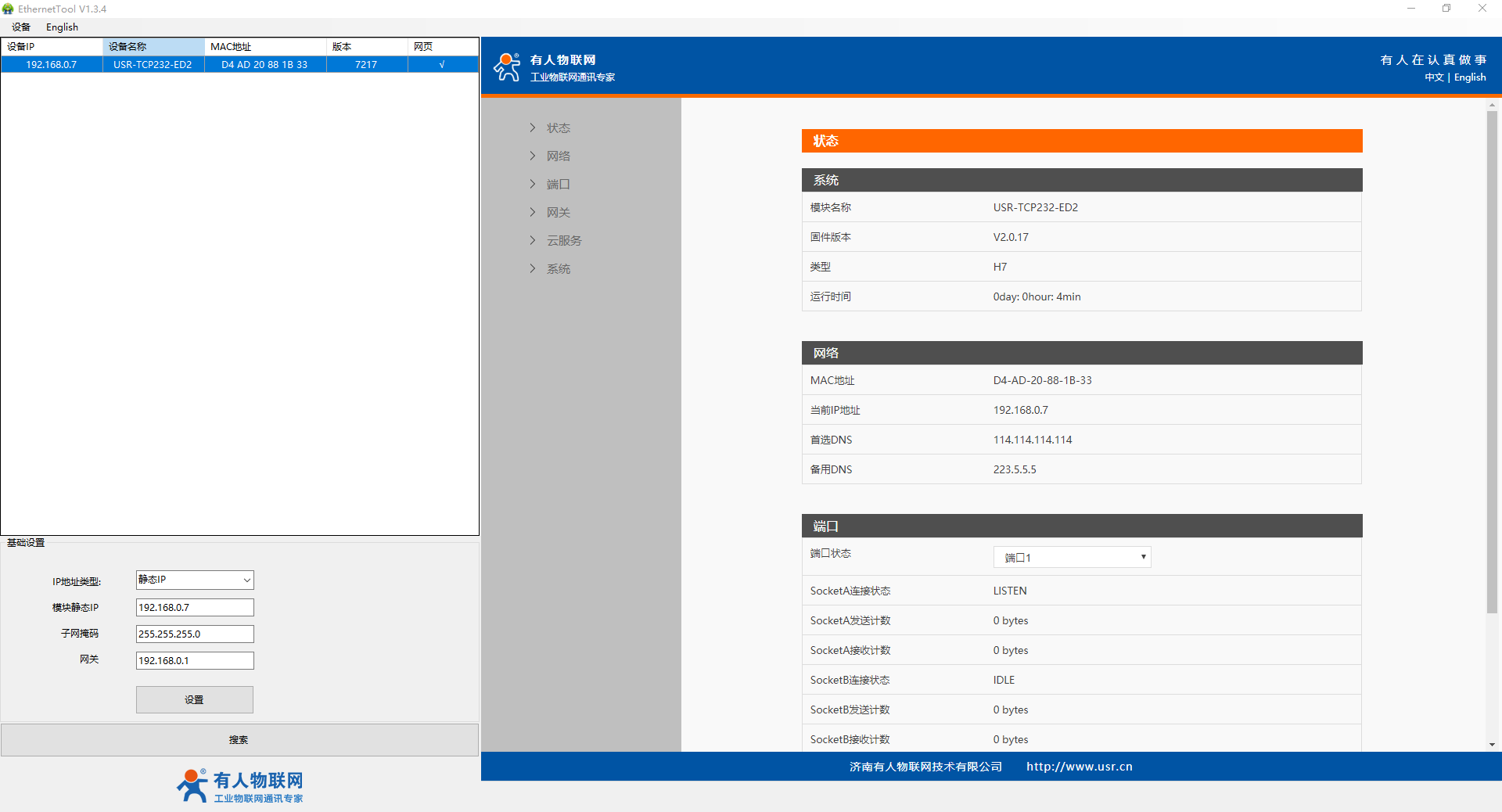 2、USR-TCP232-ED2網(wǎng)頁(yè)切換中文顯示