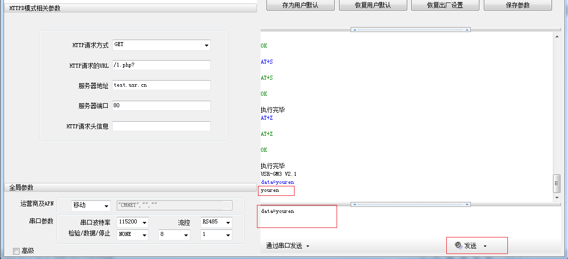 5、模塊設(shè)置參數(shù):打開(kāi)設(shè)置軟件,模塊設(shè)置為Httpd Client模式,請(qǐng)求方式GET,URL為/1.php?,設(shè)置服務(wù)器地址test.usr.cn,端口80,設(shè)置并保存所有參數(shù),重啟模塊。(本說(shuō)明文檔使用為有人測(cè)試服務(wù)器)