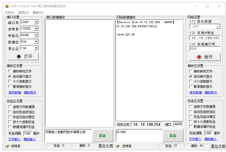網(wǎng)絡(luò)數(shù)據(jù)接收到USR-WIFI232-B2的IP和MAC,收到IP和MAC后,立刻發(fā)送+ok(不帶回車發(fā)送),發(fā)送完就是進(jìn)入網(wǎng)絡(luò)AT指令,可以發(fā)送USR-WIFI232-B2的AT指令,去查詢參數(shù)。