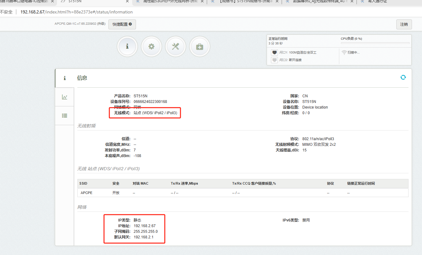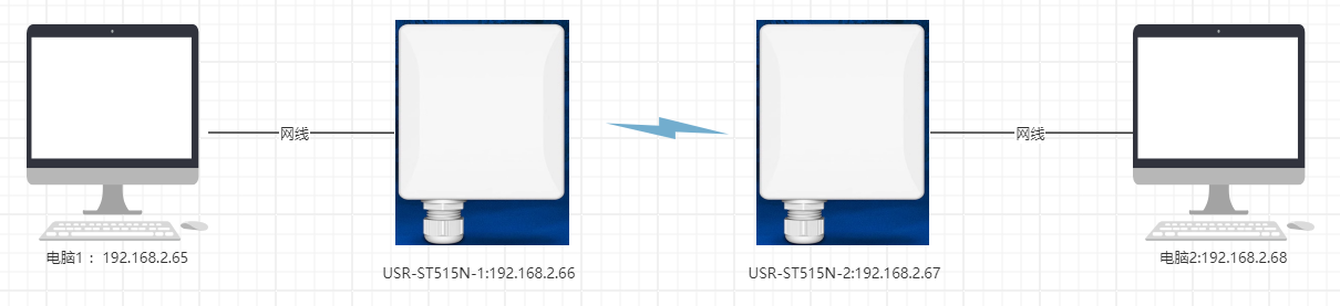 USR-ST515N -1的網(wǎng)口通過網(wǎng)線接到配套適配器的POE口,配套適配器上LAN口通過網(wǎng)線接到電腦1網(wǎng)口上,電腦1的IP設(shè)置為192.168.2.65,USR-ST515N -2的網(wǎng)口通過網(wǎng)線接到配套適配器的POE口,配套適配器上LAN口通過網(wǎng)線接到電腦2網(wǎng)口上,電腦2的IP設(shè)置為192.168.2.68。