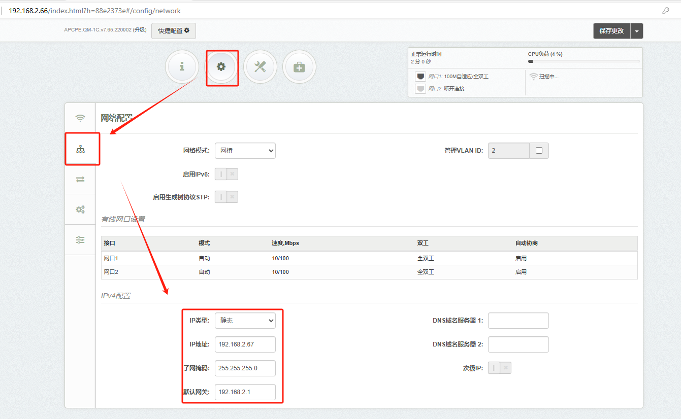 網(wǎng)絡(luò)設(shè)置中可需改設(shè)備的IP ,本例中國接入點(diǎn)設(shè)備保持出廠默認(rèn)的IP信息
