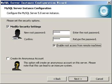 這一步詢問是否要修改默認(rèn)root用戶(超級(jí)管理)的密碼(默認(rèn)為空),“New root password”如果要修改,就在此填入新密碼(如果是重裝,并且之前已經(jīng)設(shè)置了密碼,在這里更改密碼可能會(huì)出錯(cuò),請留空,并將“Modify Security Settings”前面的勾去掉,安裝配置完成后另行修改密碼),“Confirm(再輸一遍)”內(nèi)再填一次,防止輸錯(cuò)。 “Enable root access from remote machines(是否允許root用戶在其它的機(jī)器上登陸,如果要安全,就不要勾上,如果要方便,就勾上它)”。最后“Create An Anonymous Account(新建一個(gè)匿名用戶,匿名用戶可以連接數(shù)據(jù)庫,不能操作數(shù)據(jù),包括查詢)”,一般就不用勾了,設(shè)置完畢,按“Next”繼續(xù)。