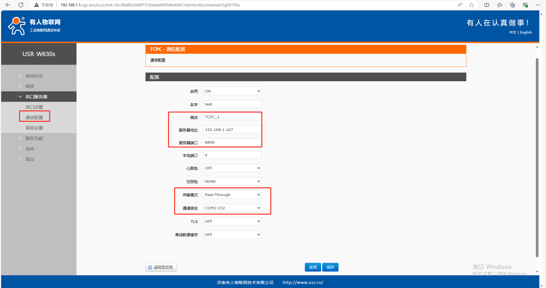 (2)跳轉(zhuǎn)到TCPC-通信配置頁(yè)面,服務(wù)器地址填電腦IP 192.168.1.167,服務(wù)器端口填8899,傳輸模式選擇Pass-Through,通道綁定選擇COM2-232。點(diǎn)擊應(yīng)用。