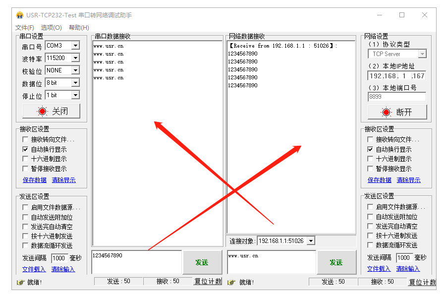 3、測(cè)試串口端向網(wǎng)絡(luò)端發(fā)送數(shù)據(jù),網(wǎng)絡(luò)端也可以向串口端發(fā)送數(shù)據(jù)。