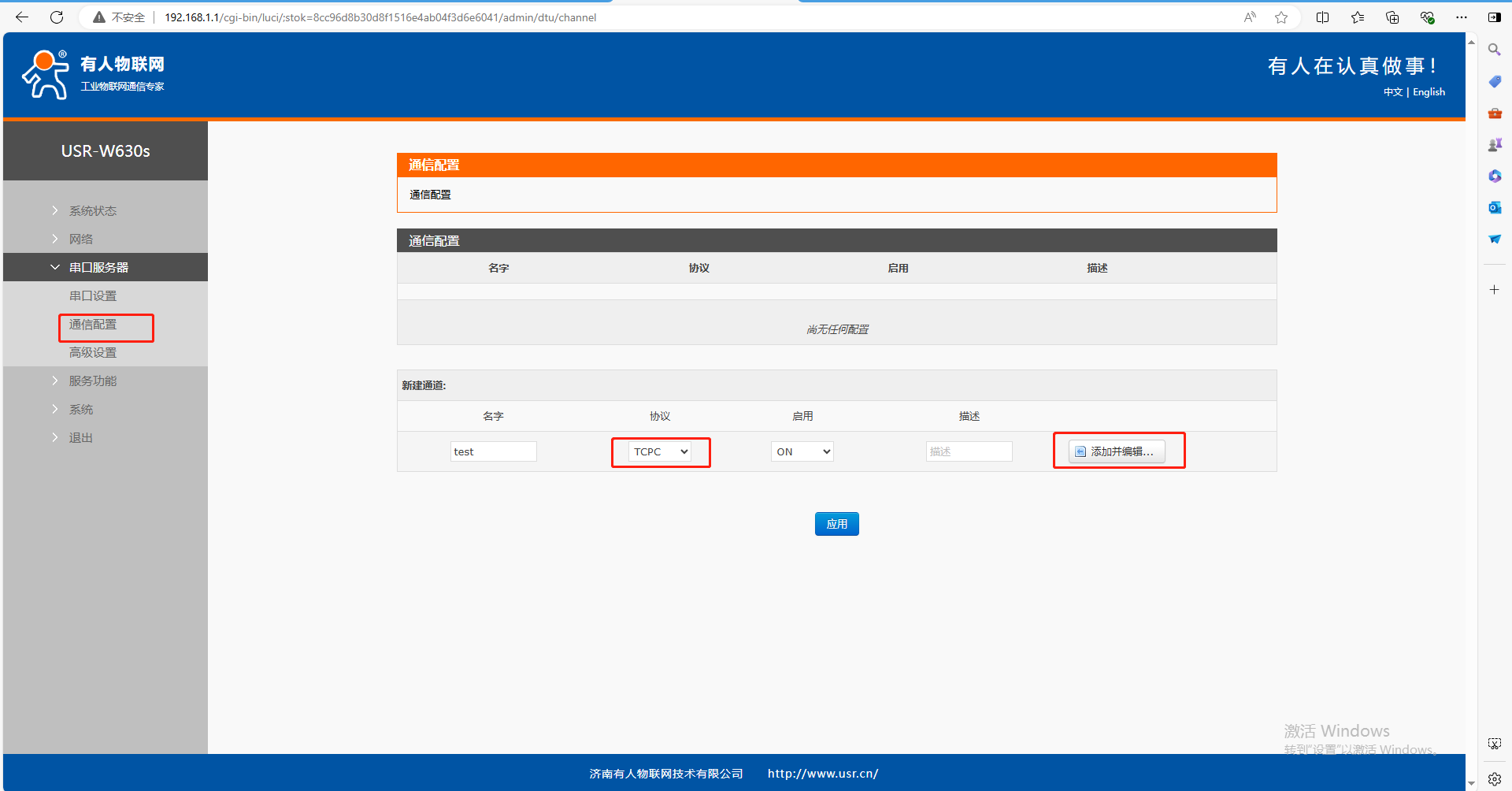 (1)通信配置,新建通道,協(xié)議TCPC,啟用ON,點(diǎn)擊添加并編輯。