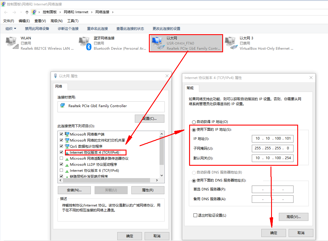 4、打開第1臺電腦的控制面板,將以太網(wǎng)卡設置靜態(tài)IP,IPv4設置10.10.100.101,子網(wǎng)掩碼255.255.255.0,默認網(wǎng)關10.10.100.254,點擊確定。
