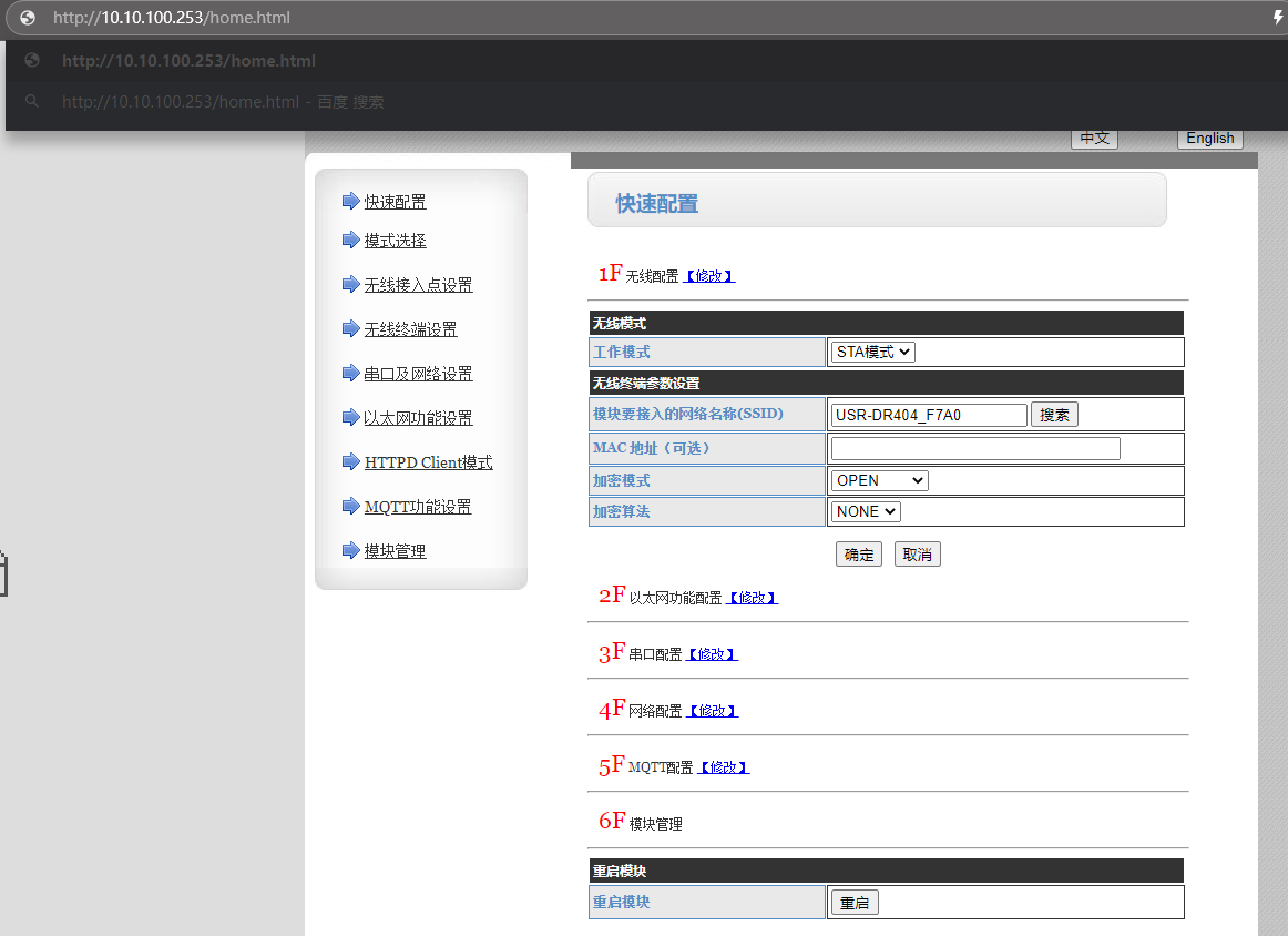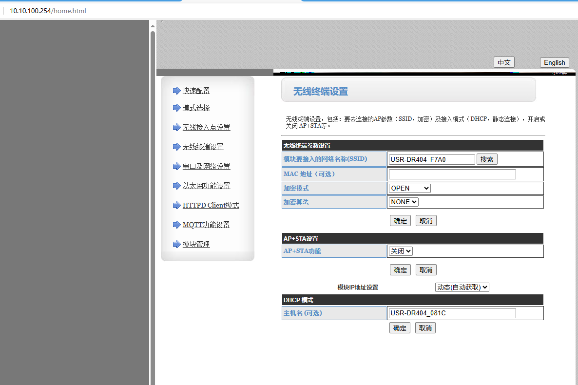 3、設置STA模式,無線終端,輸入模塊要連接的網(wǎng)絡名稱USR-DR404_F7A0。以太網(wǎng)功能設置,開啟網(wǎng)口,選擇LAN口,網(wǎng)口模式選擇Z橋接模式。無線接入點IP設置10.10.100.253。每設置一項參數(shù),對應點擊下面的確定,最后網(wǎng)頁重啟USR-DR404。