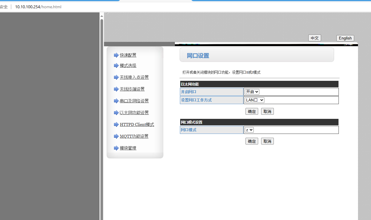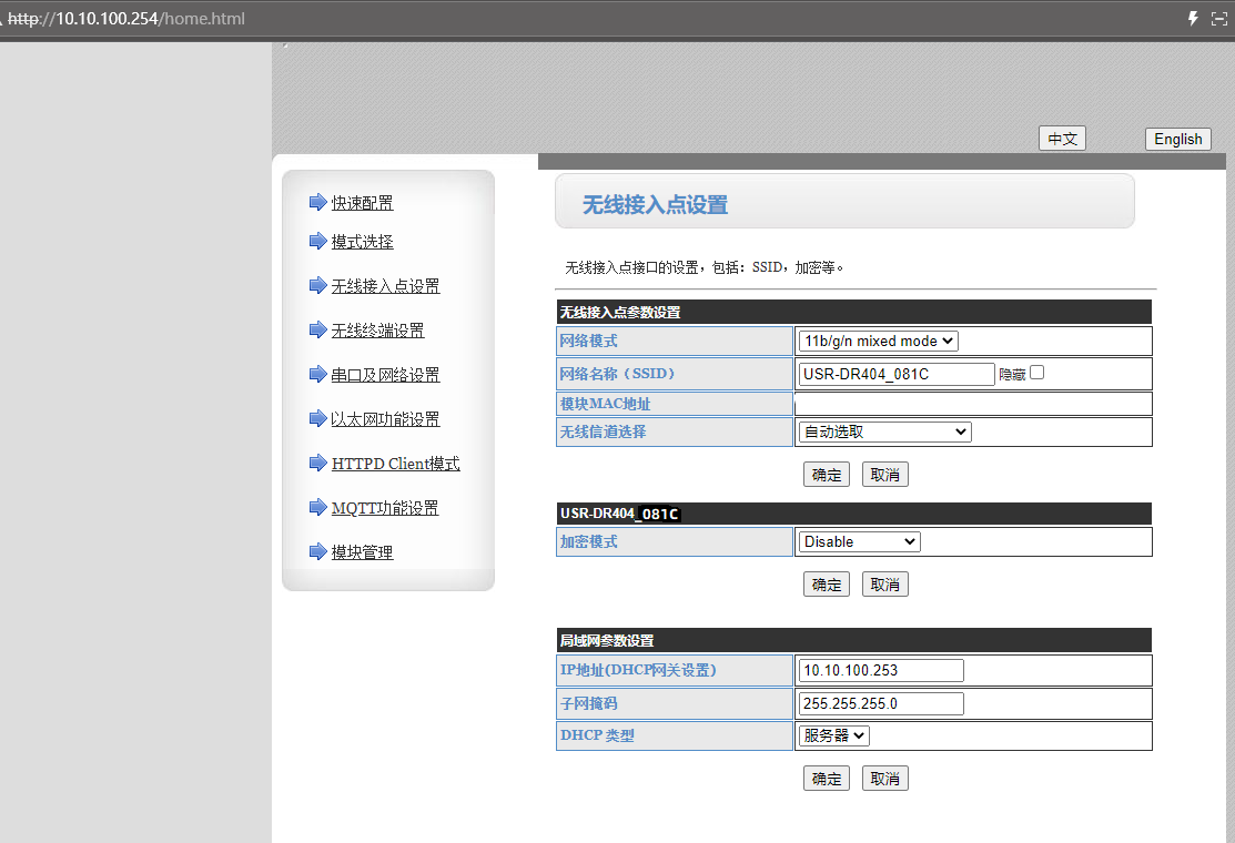 3、設置AP模式,無線接入點IP設置10.10.100.254,以太網(wǎng)功能設置,開啟網(wǎng)口,選擇LAN口,每設置一項參數(shù),對應點擊下面的確定,最后網(wǎng)頁重啟USR-DR404。