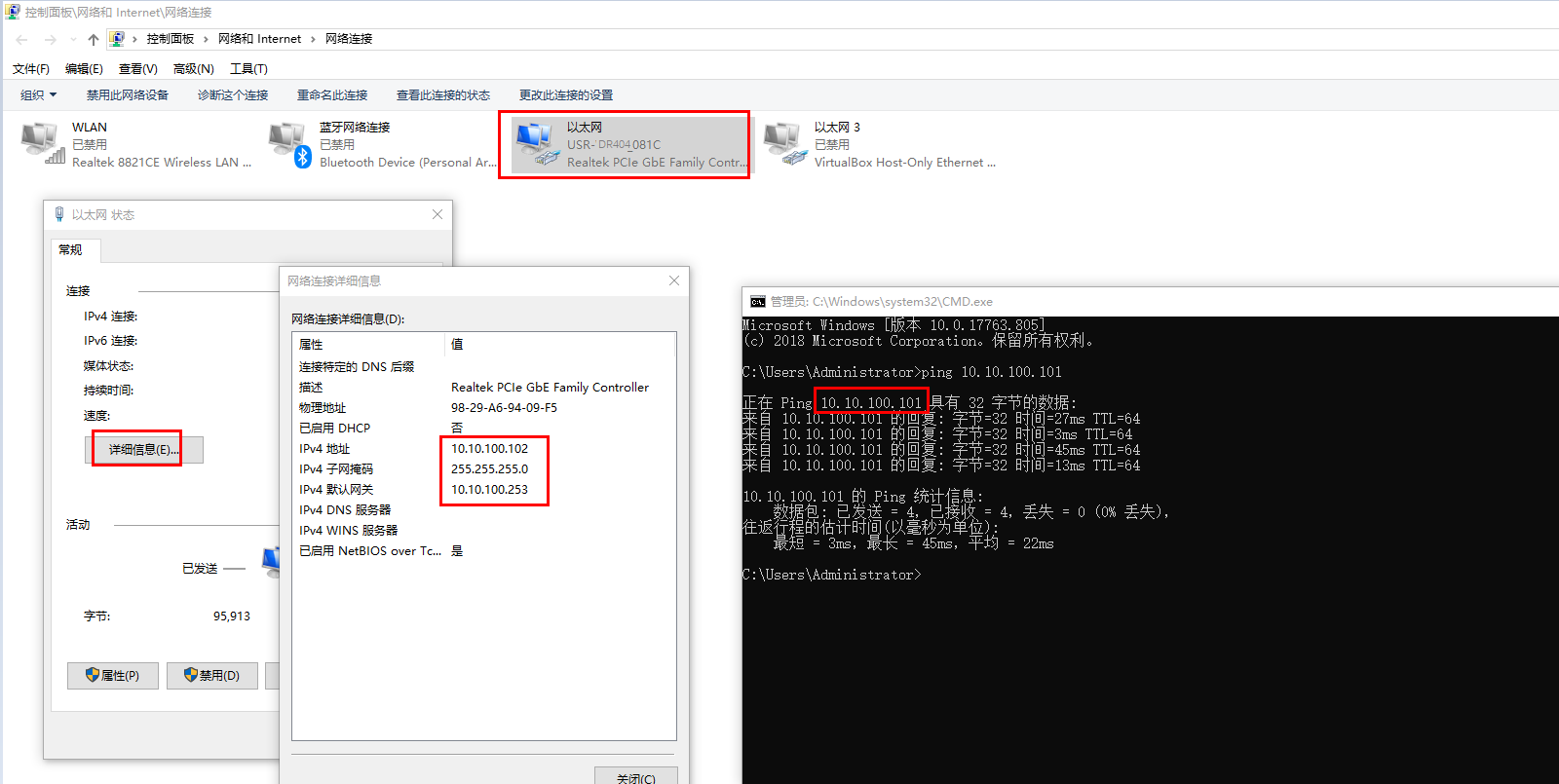4、打開第2臺電腦的控制面板,將以太網(wǎng)卡設置靜態(tài)IP,IPv4設置10.10.100.102,子網(wǎng)掩碼255.255.255.0,默認網(wǎng)關10.10.100.253,點擊確定。