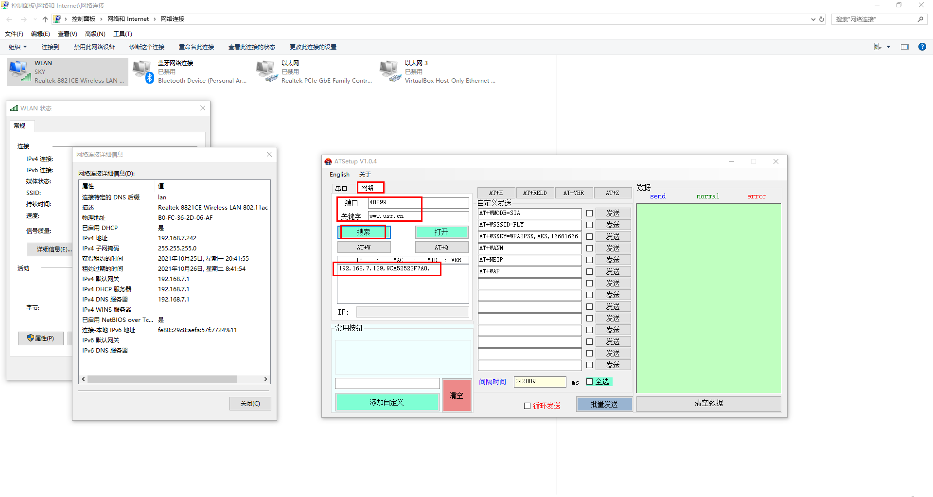 1、USR-W610和電腦連接同一個(gè)路由器,電腦打開ATSetup軟件,端口用48899,關(guān)鍵字用lifj.com.cn,使用搜索功能,搜索這個(gè)時(shí)候USR-W610連接路由器后,路由器給USR-W610分配的IP。192.168.7.129。