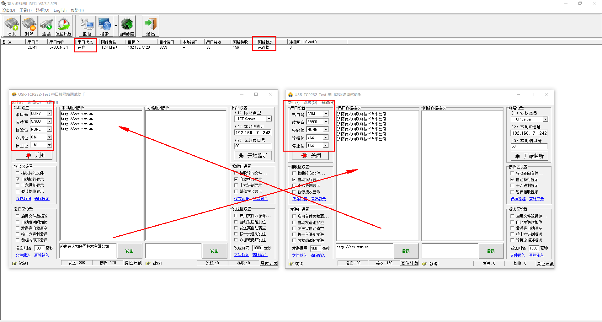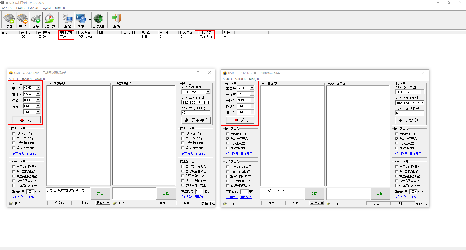 4、使用兩個(gè)串口助手,打開實(shí)際串口和虛擬串口,然后相互發(fā)送數(shù)據(jù)。