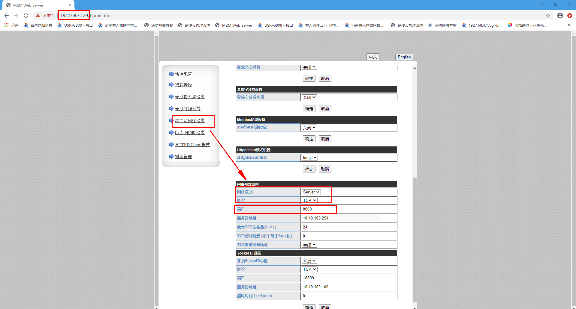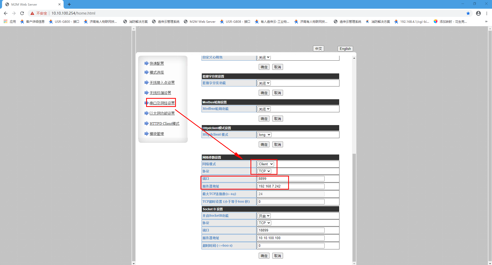 5、USR-W610內(nèi)置網(wǎng)頁,串口及網(wǎng)絡(luò)設(shè)置,設(shè)置協(xié)議TCP,網(wǎng)絡(luò)模式Client,端口8899,服務(wù)器地址填電腦IP 192.168.7.242,點(diǎn)擊確定。最后網(wǎng)頁重啟USR-W610。