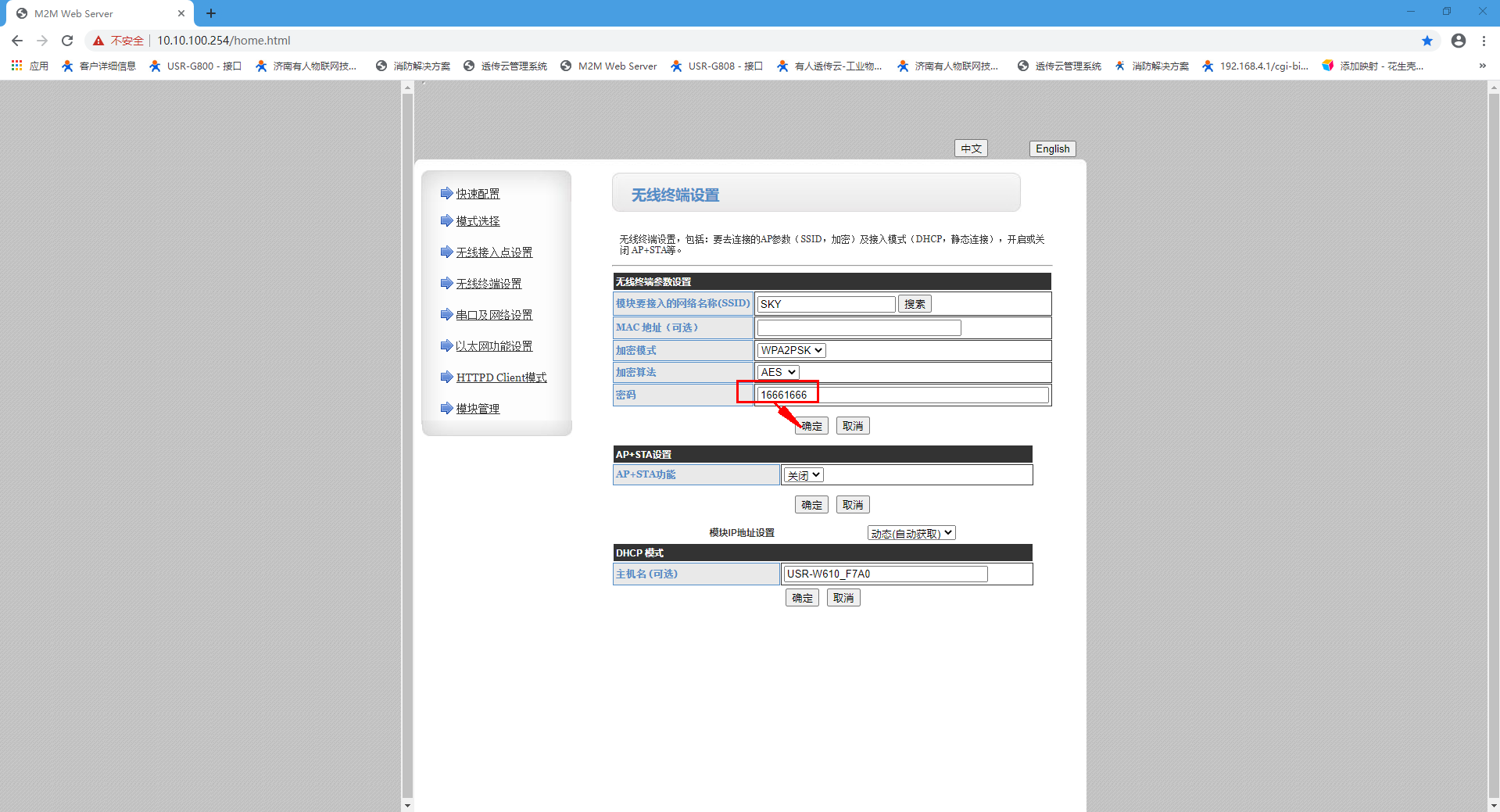 3、登錄USR-W610的內(nèi)置網(wǎng)頁后,在無線終端設(shè)置,修改動(dòng)態(tài)(自動(dòng)獲?。└臑殪o態(tài)(固定IP)