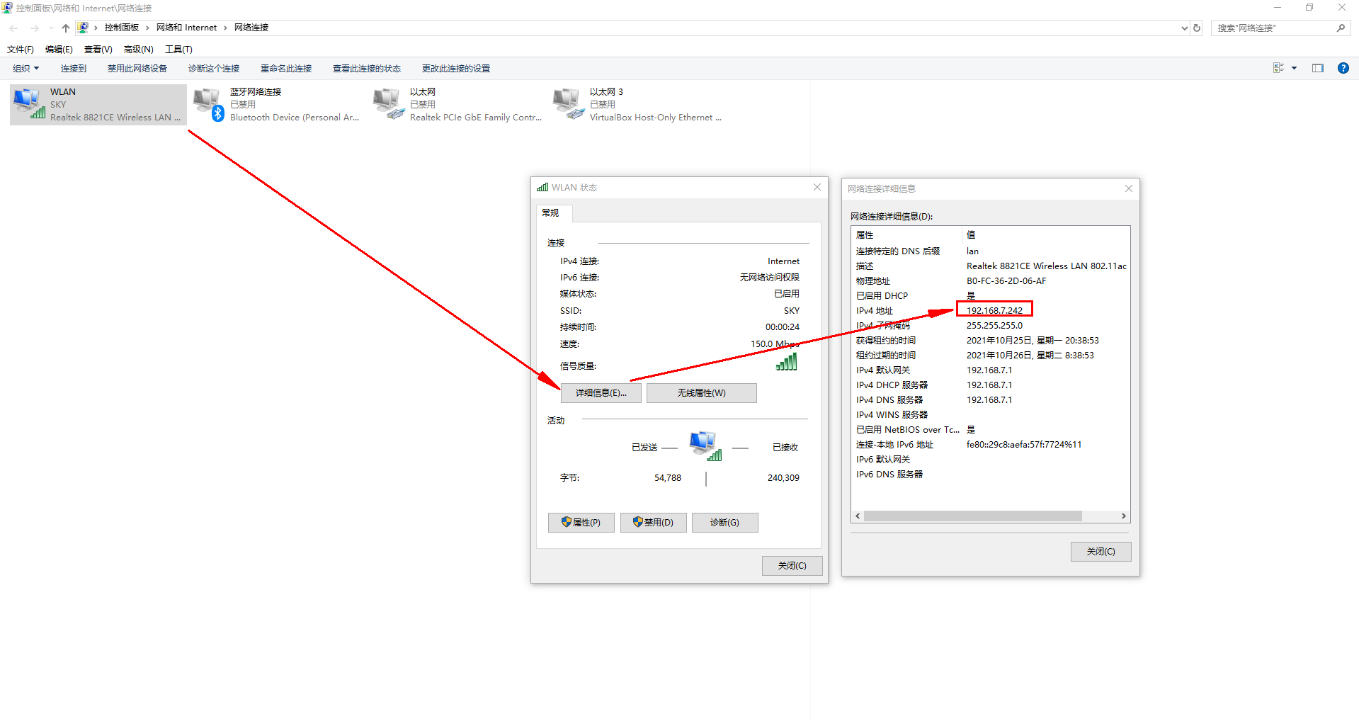 4、電腦連接路由器WiFi,打開電腦的控制面板,查看無線網(wǎng)卡狀態(tài),IPv4是192.168.7.242。