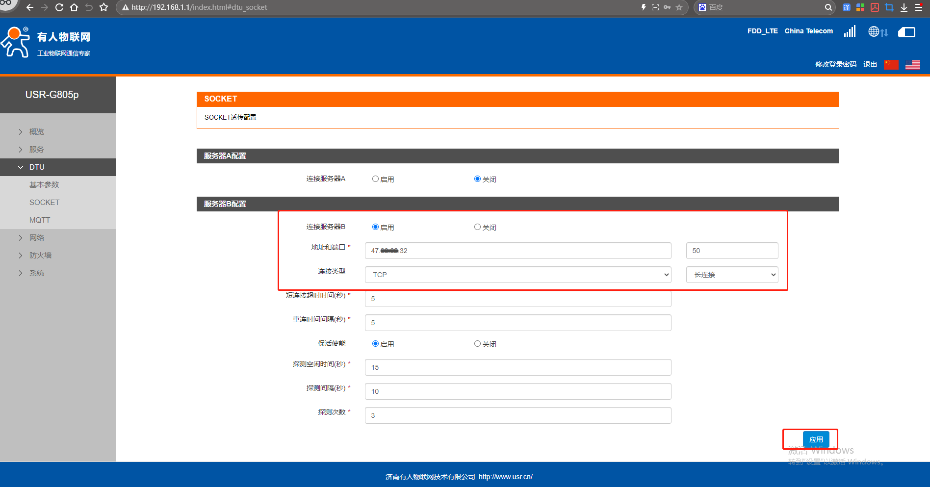 網(wǎng)頁點擊DTU,點擊SOCKET,連接服務器B,點擊啟用,地址填遠程服務器,端口號50,連接類型TCP,長連接。點擊應用。