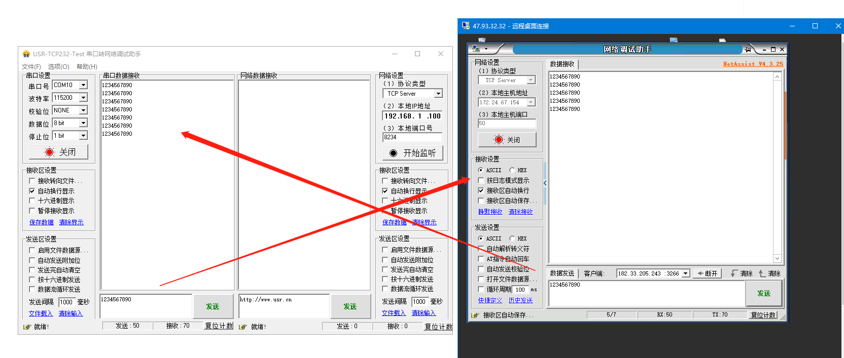 1、打開遠程桌面,打開網(wǎng)絡助手,協(xié)議類型做TCP server,端口50,點擊連接。