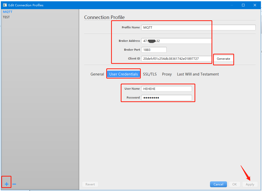 (5)點(diǎn)擊User Credentials,User NAME輸入MQTT服務(wù)器的用戶名,Password輸入MQTT服務(wù)器的密碼。