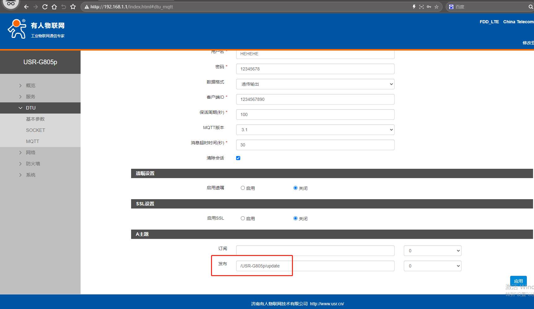 (2)A主題,發(fā)布填寫(xiě)/USR-G805p/update。