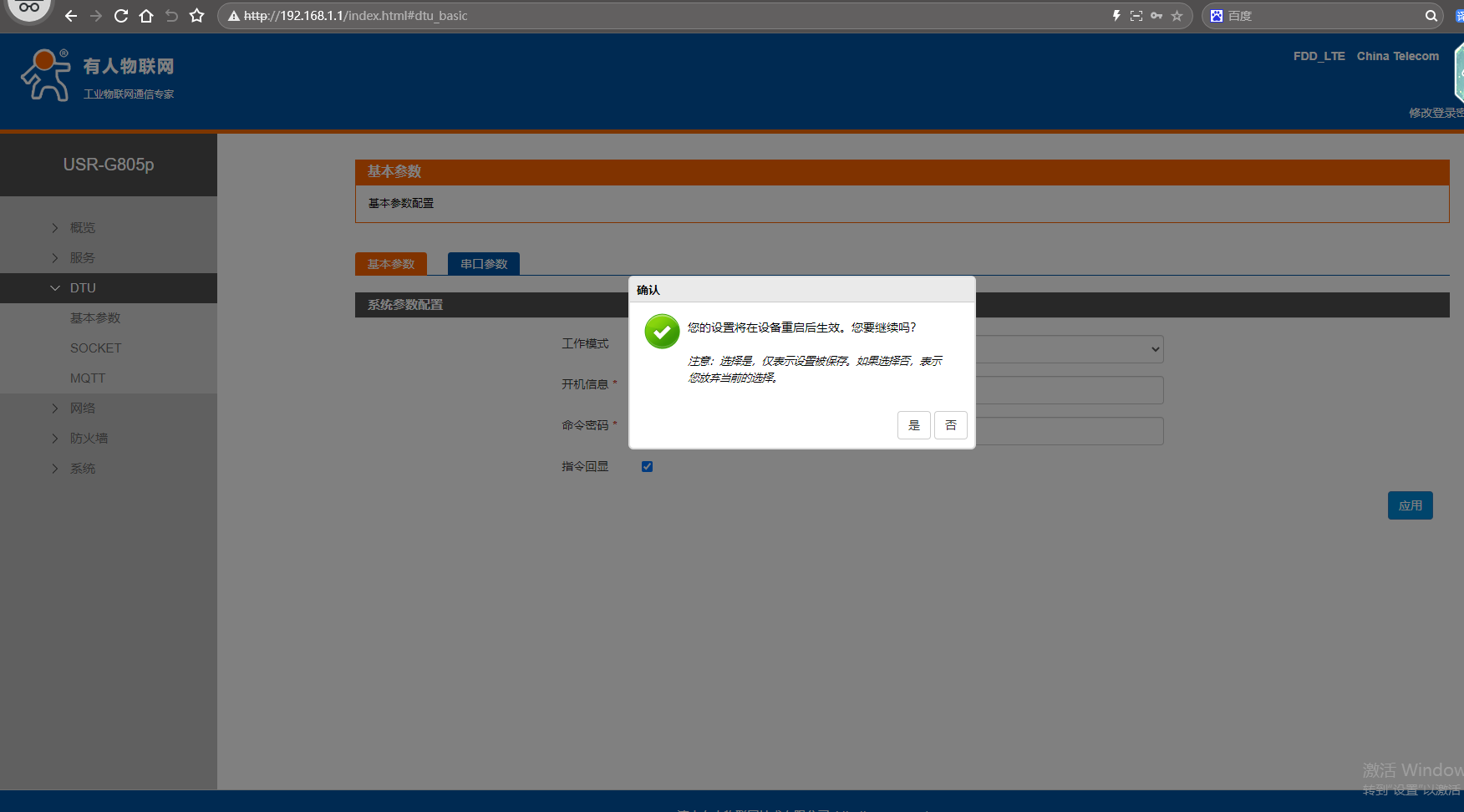 網頁點擊DTU,點擊基本參數,工作模式選擇MQTT模式。點擊應用。