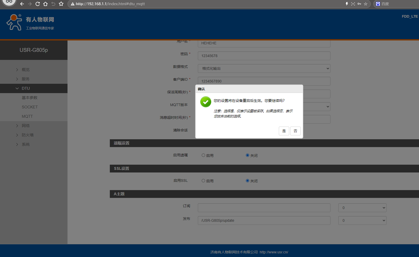 (2)A主題,發(fā)布填寫/USR-G805p/update。