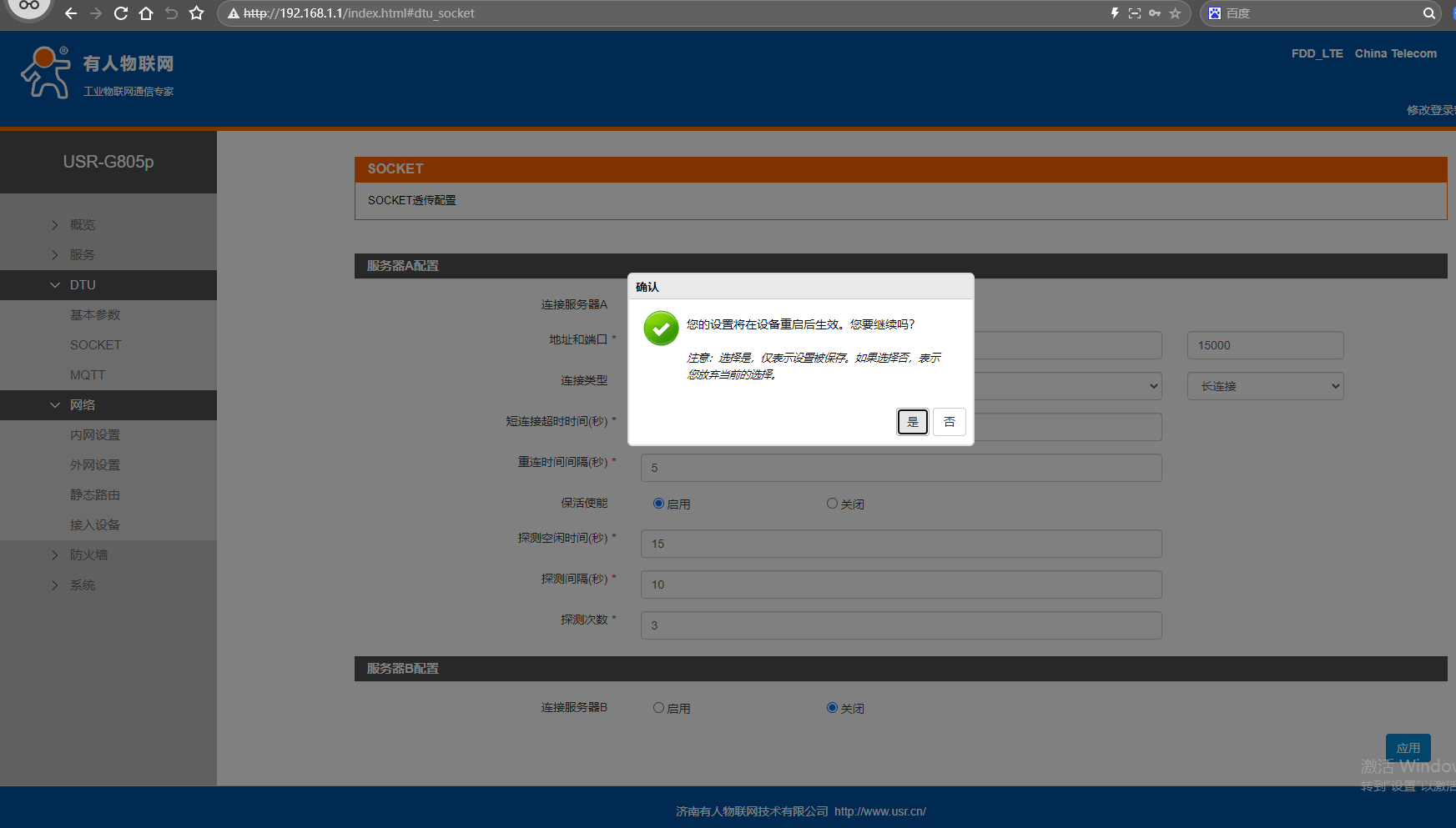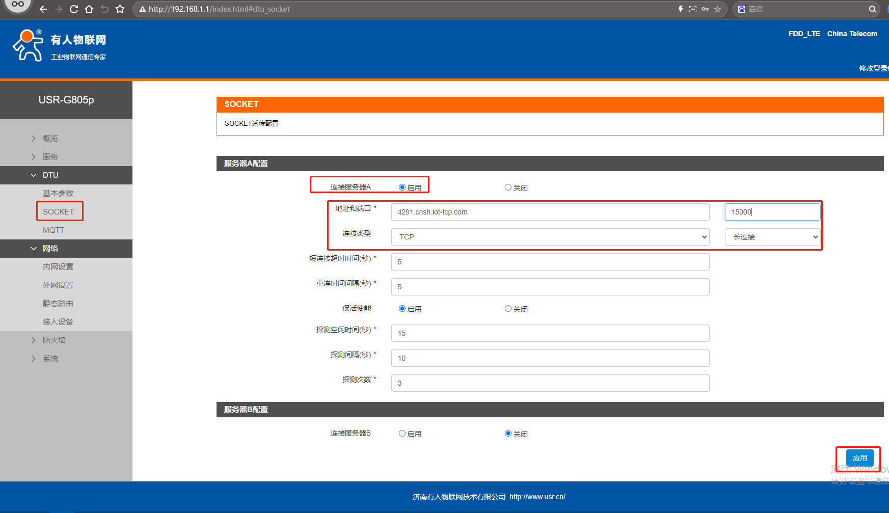 網(wǎng)頁(yè)點(diǎn)擊DTU,點(diǎn)擊SOCKET,連接服務(wù)器A,點(diǎn)擊啟用,地址填4291.cnsh.iot-tcp.com,端口號(hào)15000,連接類型TCP,長(zhǎng)連接。點(diǎn)擊應(yīng)用。