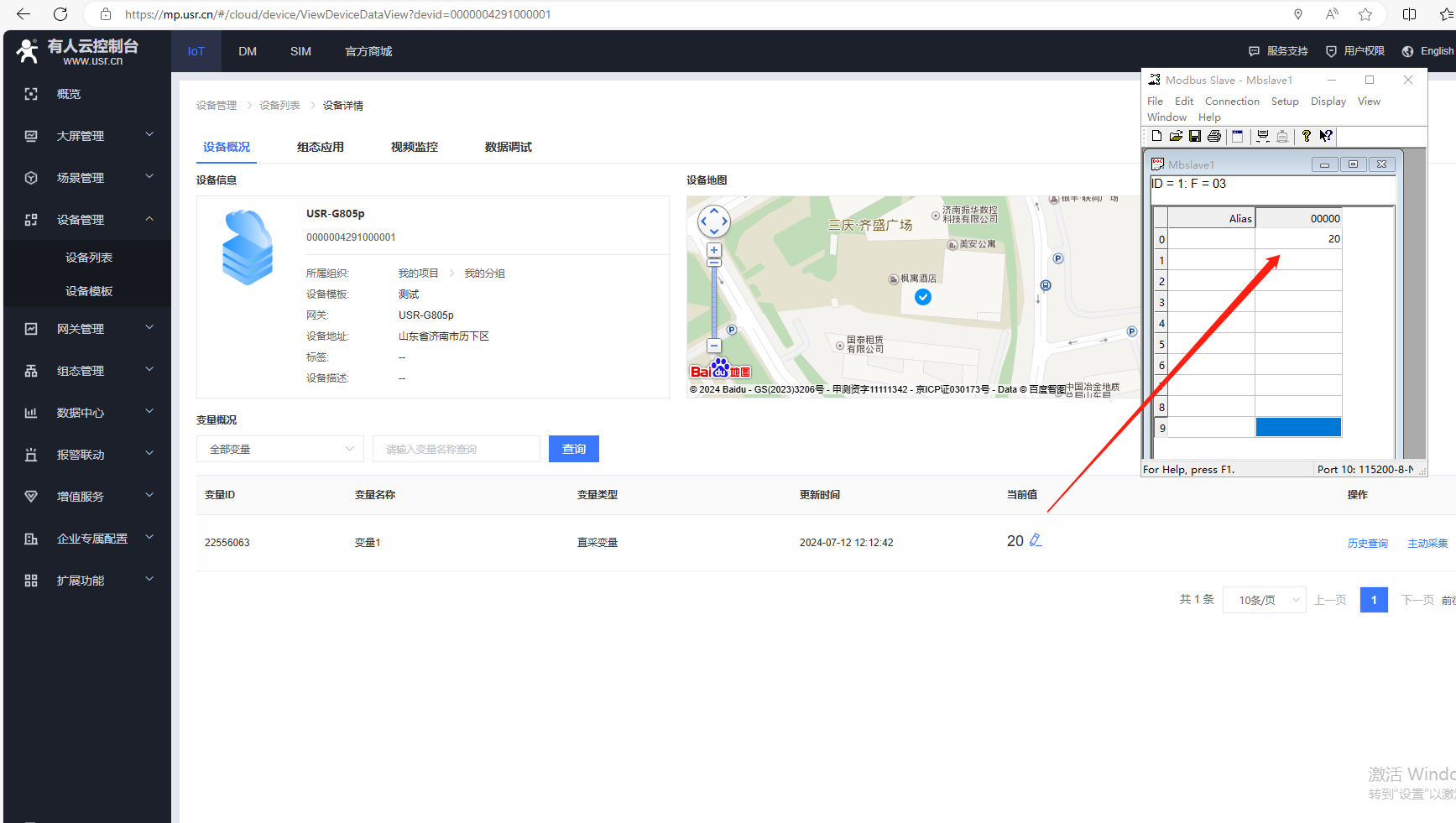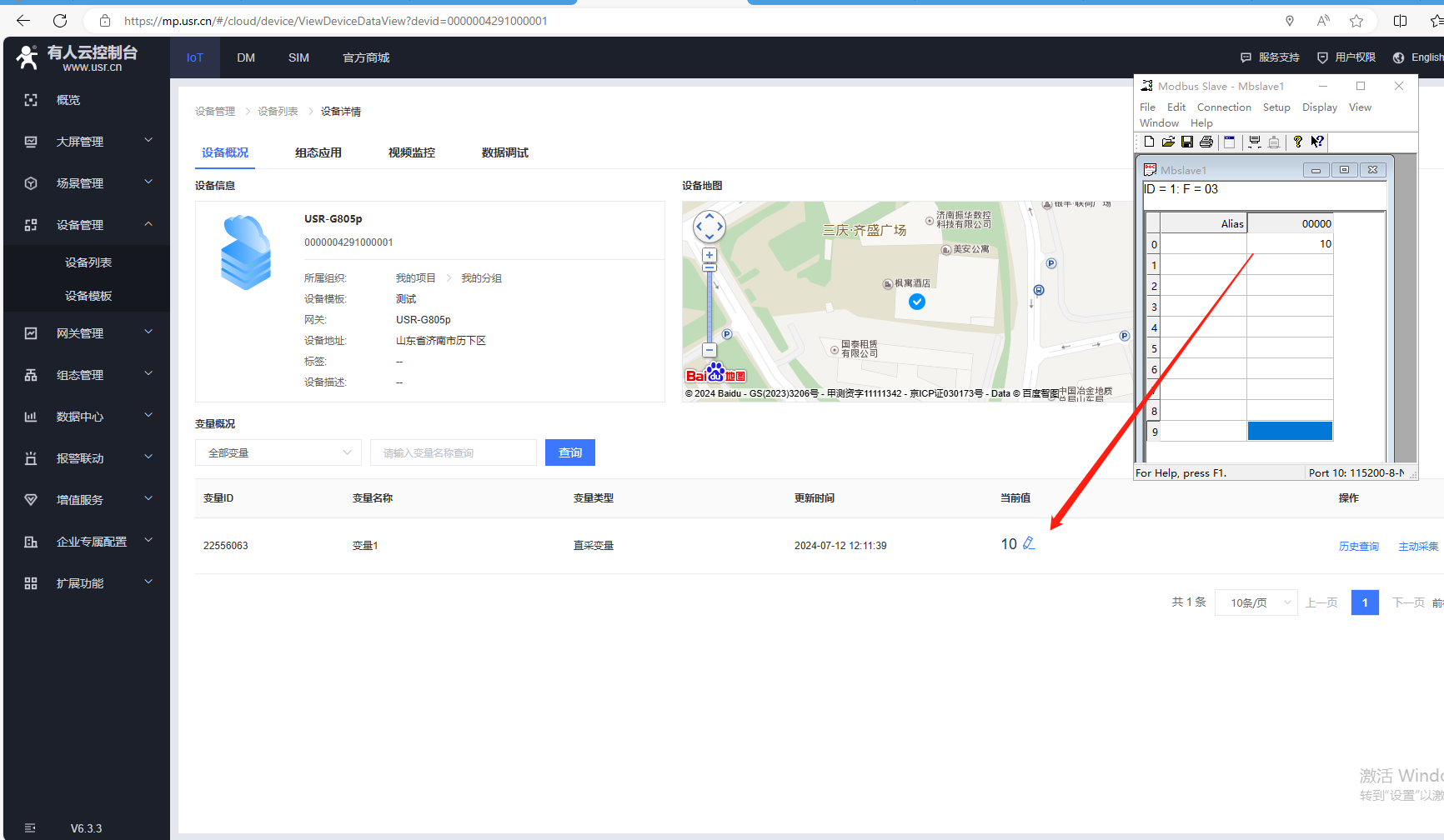 2、MODBUS slave數(shù)據(jù)設(shè)置10,有人云設(shè)備列表1分鐘采集,可以看到變量采集的當(dāng)前值數(shù)據(jù)10。
