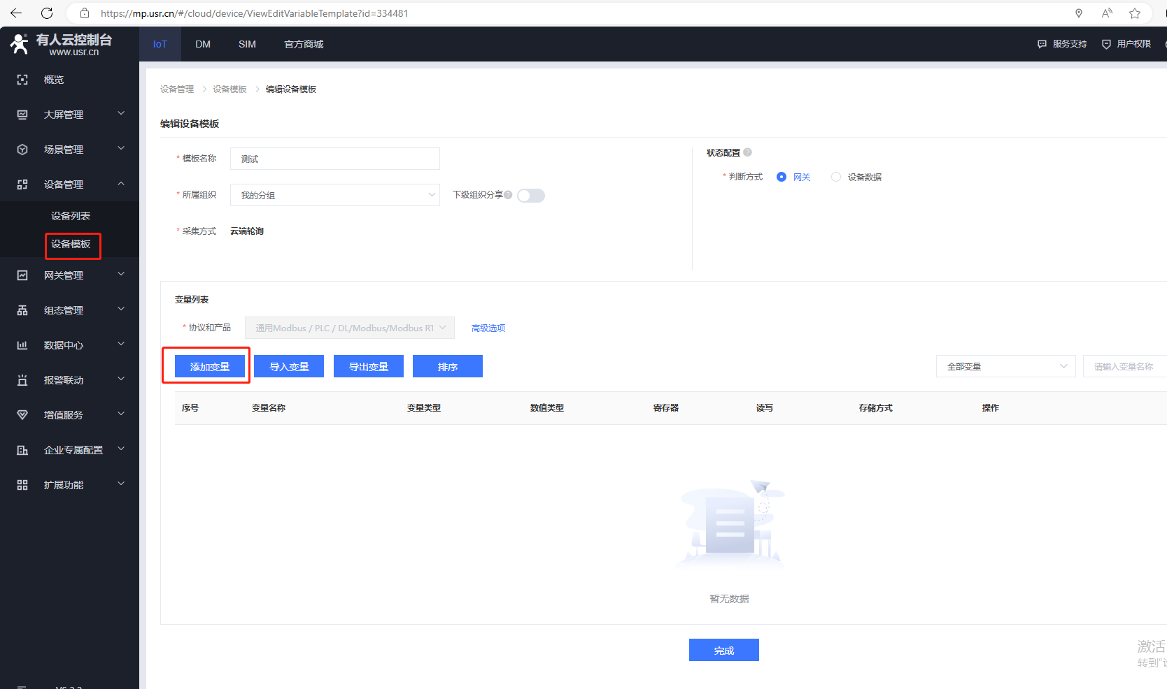 (7)添加變量,點(diǎn)擊設(shè)備管理,點(diǎn)擊設(shè)備模板,點(diǎn)擊編輯。