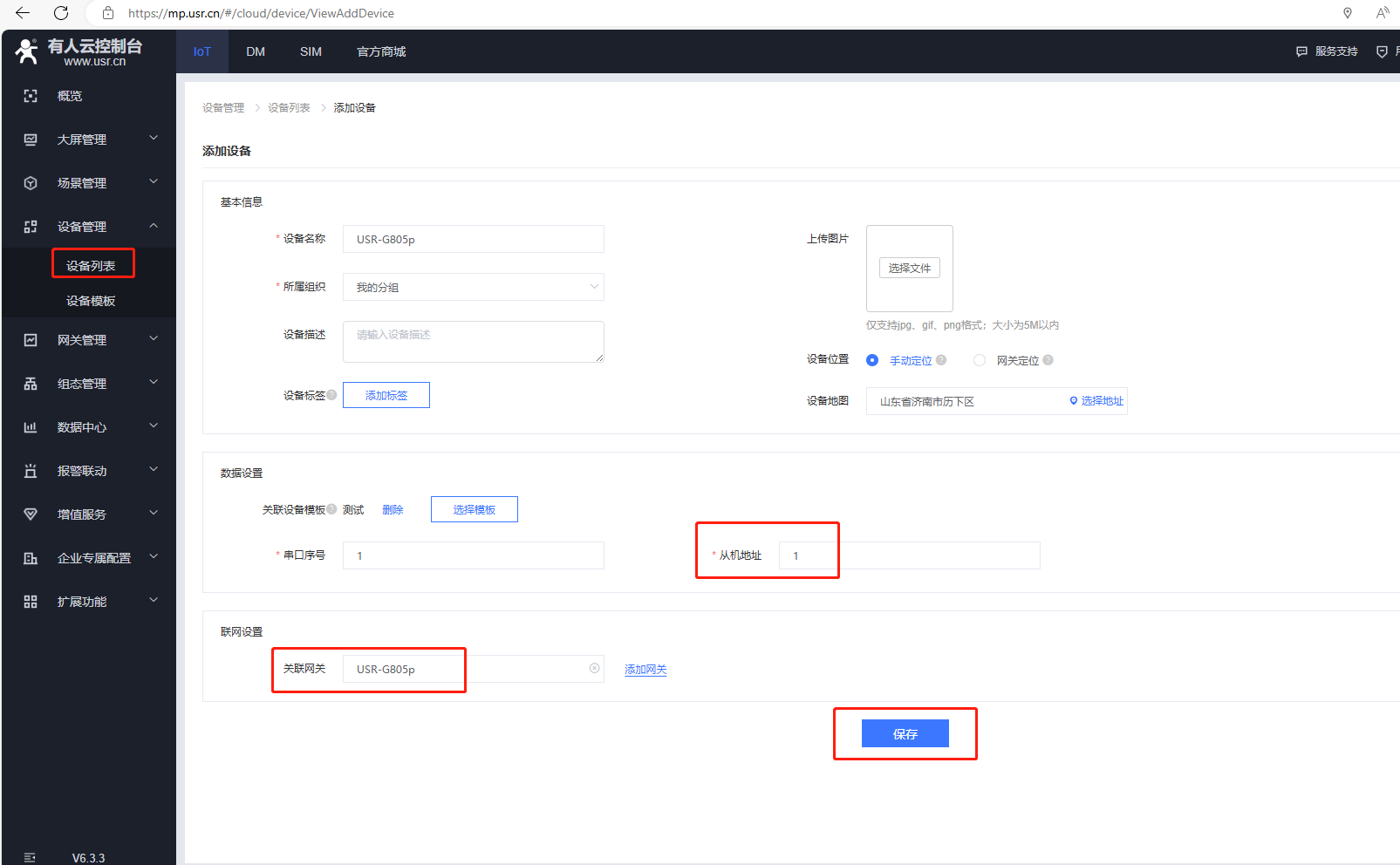 聯(lián)網(wǎng)設(shè)置,關(guān)聯(lián)網(wǎng)關(guān)選擇自身設(shè)備,USR-G805p,最后點(diǎn)擊保存。