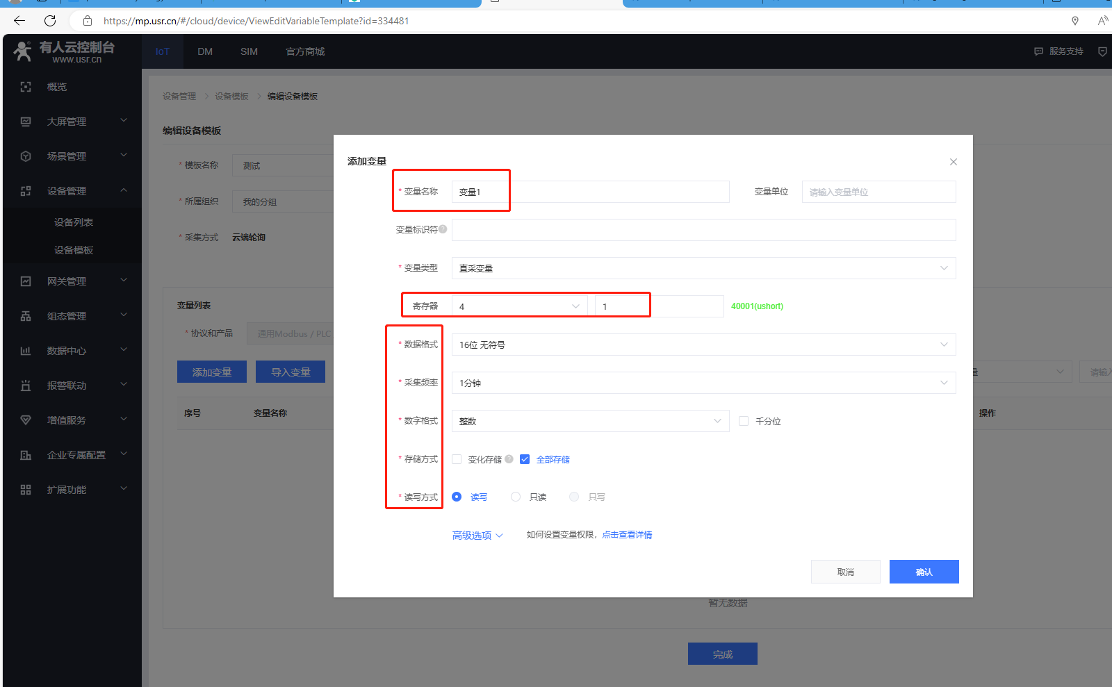 選擇新建模板,輸入設(shè)備模板名稱,通用Modbus/PLC/DL,選擇Modbus,協(xié)議選擇Modbus Rtu,采集方式云端,最后確認(rèn)。