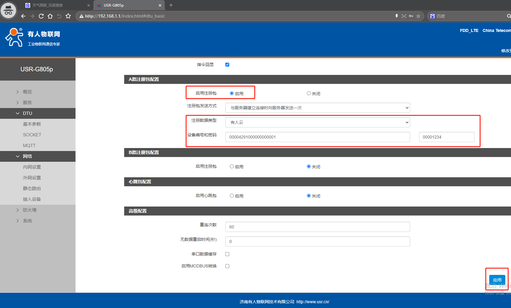 USR-G805p ID添加有人云(V6)云端輪詢示例