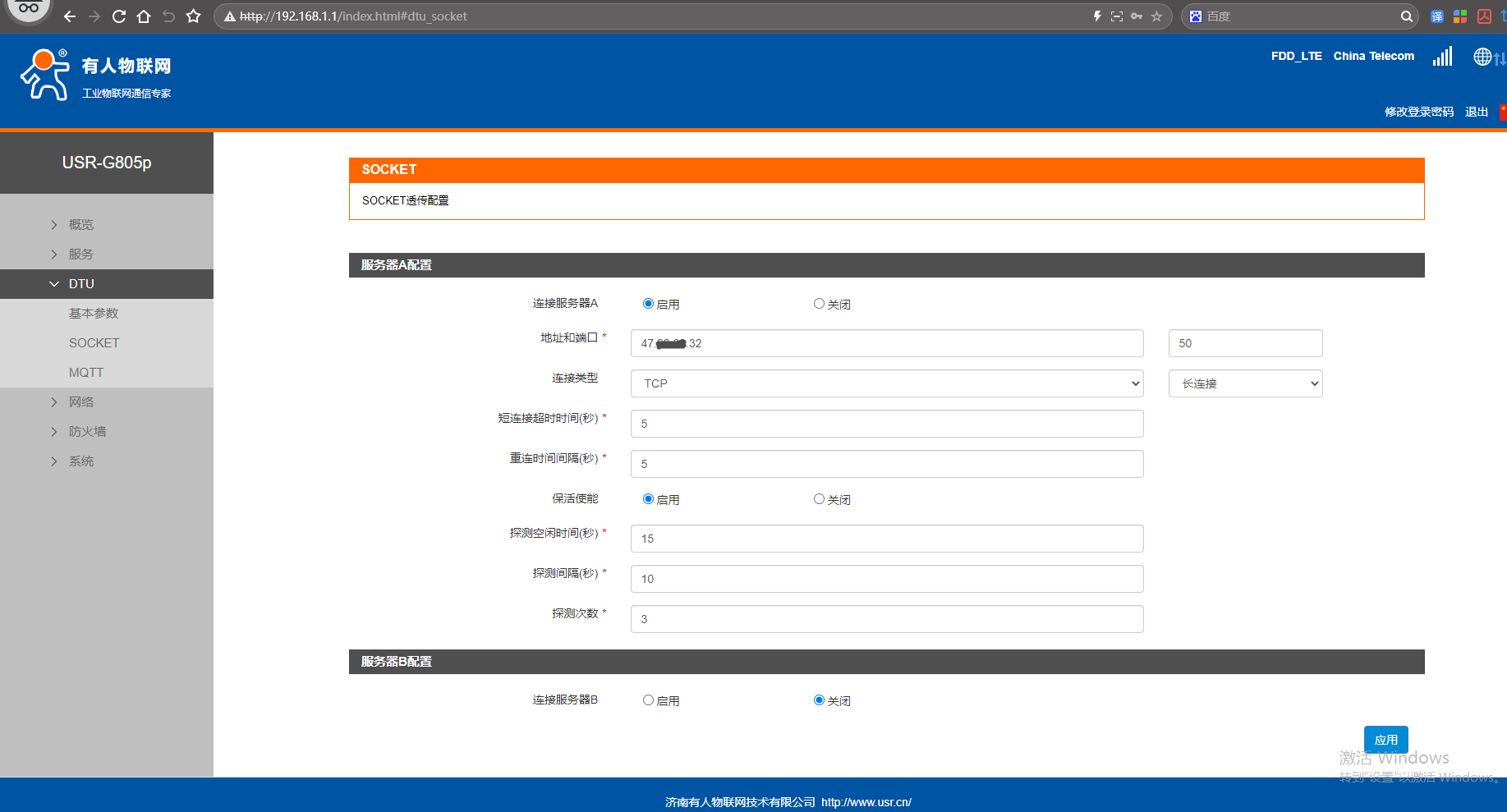 網(wǎng)頁點擊DTU,點擊SOCKET,連接服務器A,點擊啟用,地址填遠程服務器,端口號50,連接類型TCP,長連接。點擊應用。